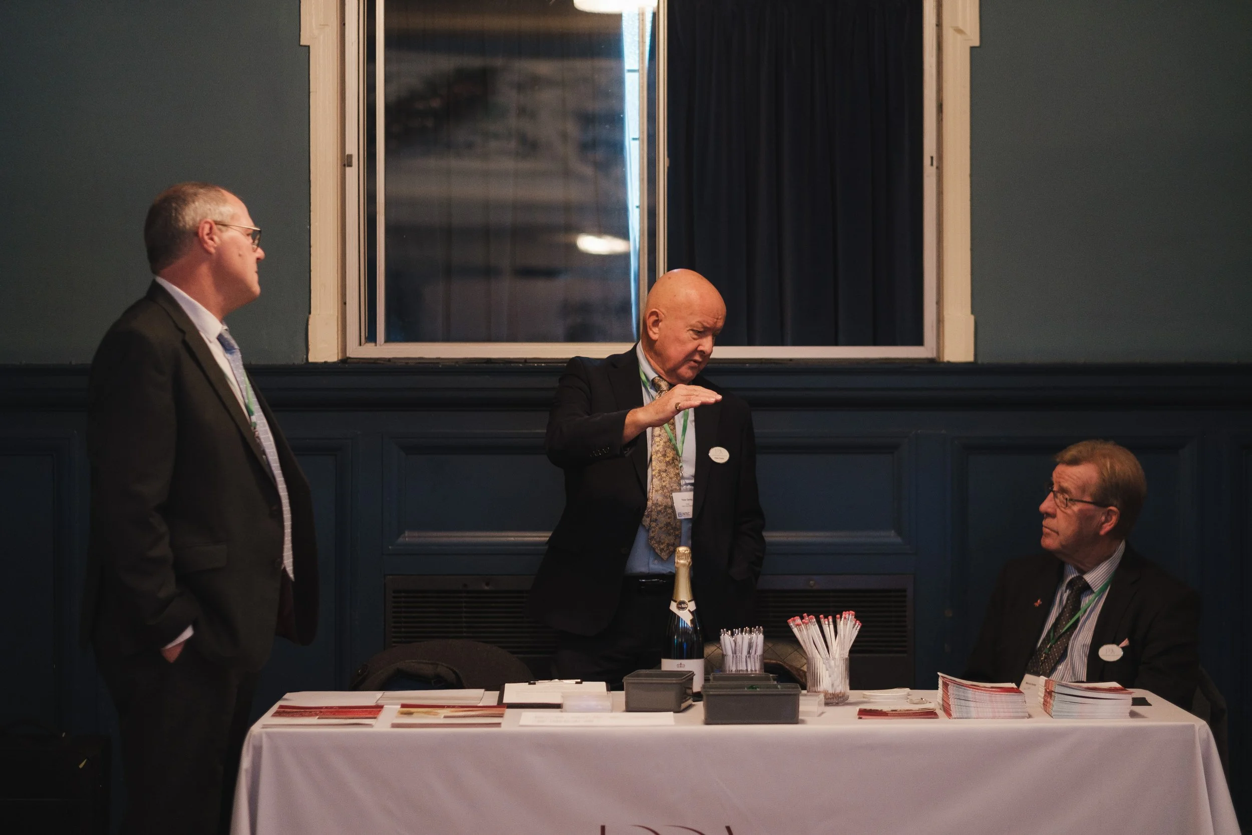 Ian, Pete, and Malc T ready to greet delegates to the PDA stand – the wine is a raffle prize, not for PDA consumption!